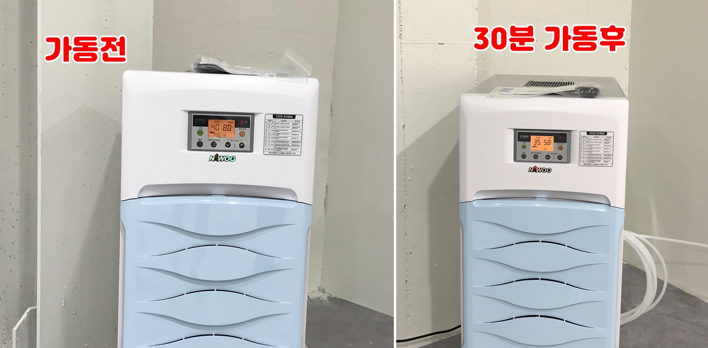 왼쪽 사진이 제습기를 바로 가동했을때 모습으로 실내습도가 80%를 나타내고 있습니다. 여름철 실내습도가 80%를 장시간 유지하면 결로현상이 바로 발생하여 천장이나 벽면에 물기가 줄줄 떨어지는 것을 볼수 있습니다.
