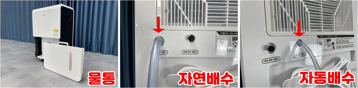 배수구가 없는 장소에는 물통으로, 물 비워주는 것이 귀찮으면 자연배수, 자동배수로 선택하여 사용하면 됩니다.