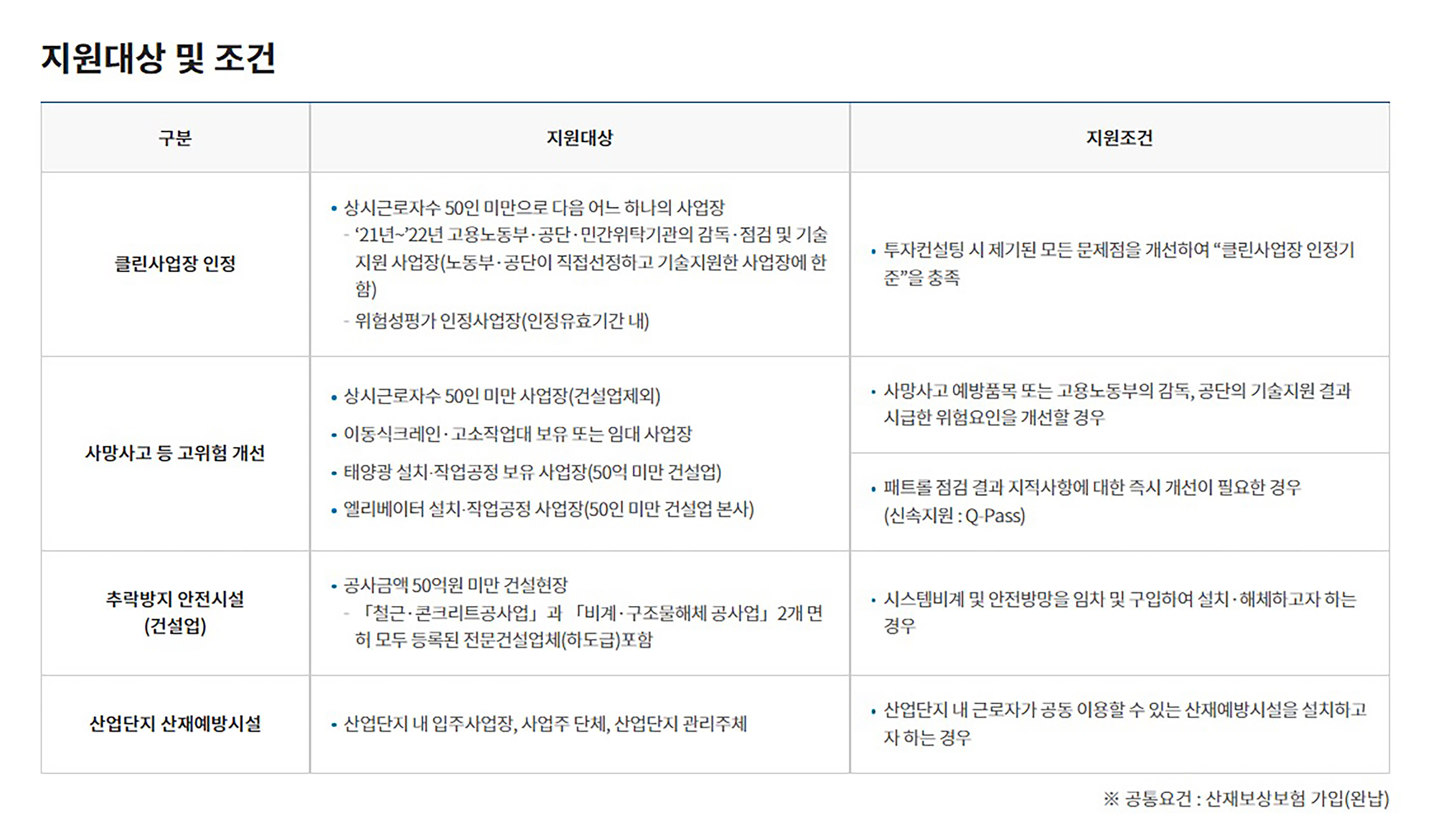 상시근로자수 50인 미만 사업장으로 산재보상보험에 가입하고 보험료 체납이 없는 사업장이 지원대상입니다.
