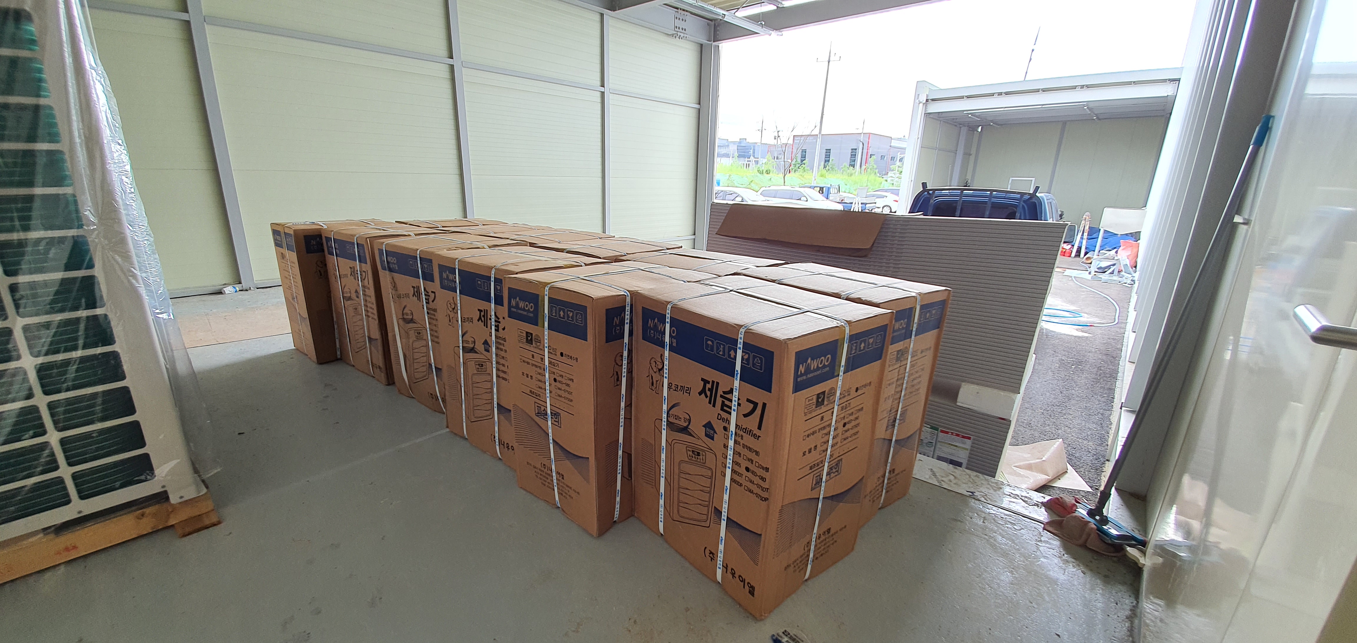 현장을 방문하여 보니 급한데로 가정용제습기를 몇대 구매해서 큰 물통에 배수호스를 연결하여 제습기를 가동하고 있었습니다. 이 물통에 물이 일정량차면 비워주고 있는데, 너무 힘들고 번거럽다고 하셨습니다.