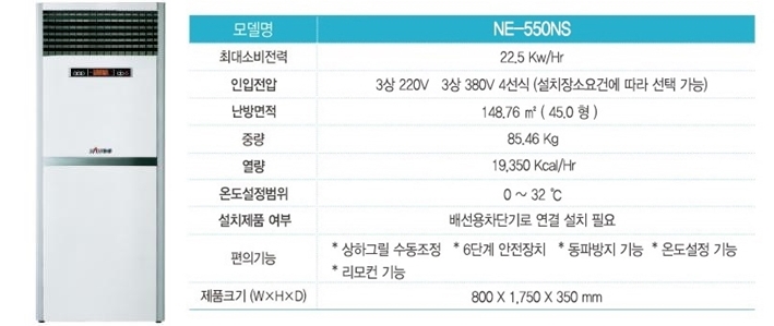 나우이엘 중형 전기온풍기 NE-550NS는 소비전력이 22.5kw/h로 난방면적은 45평형입니다.