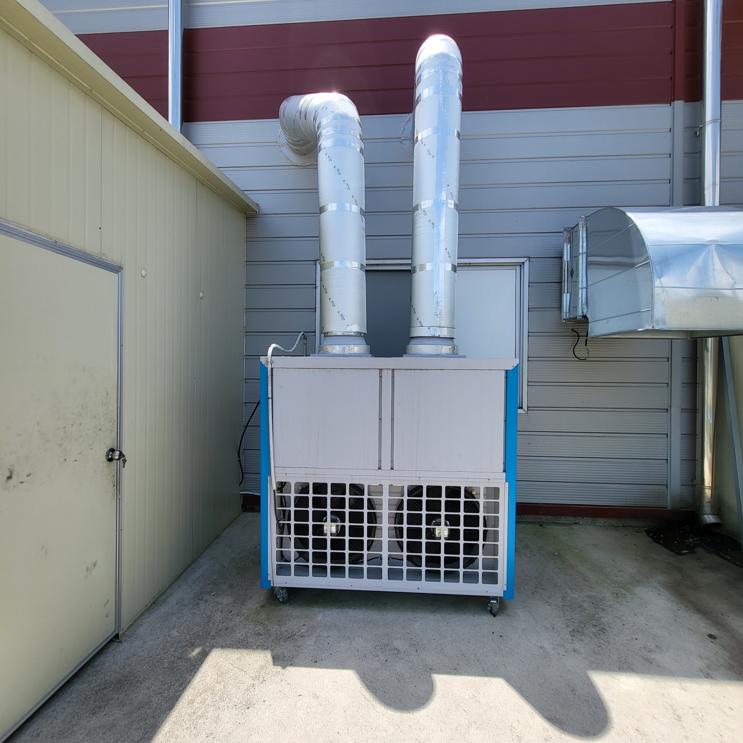 이 일체형에어컨 방식은 에어컨 본체는 건물 외부에 설치하고 덕트관을 만들어서 깨끗한 외부공기를 흡입, 냉각하여 실내 작업자 주변에 냉풍을 불어주는 방식입니다.